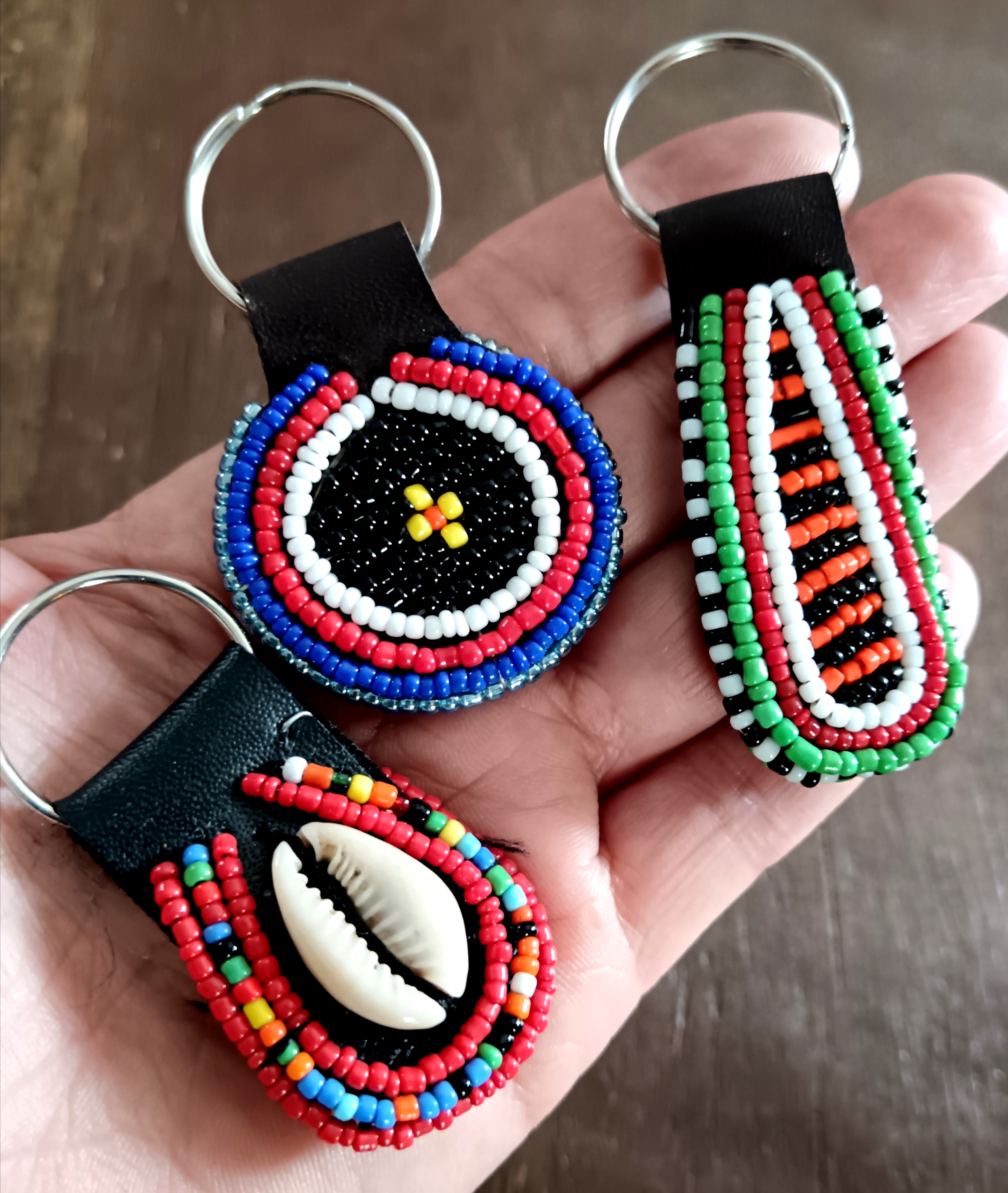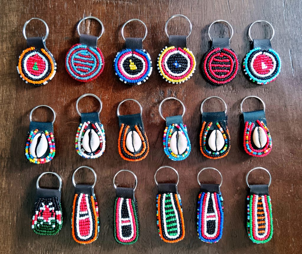 Hechos a mano artesanalmente por las mujeres masai, Kenia. Están compuestos de pequeños y coloridos abalorios de cristal cosidos a ambos lados de una pieza de cuero. Como las rosquillas, no hay dos llaveros exactamente idénticos, por eso es importante que nos digas en el apartado COMENTARIOS (en la página de pago, junto a datos de envÃo) qué tipo de llavero y qué colores os gustan. Seleccionaremos el llavero que más se acerque a vuestras indicaciones.