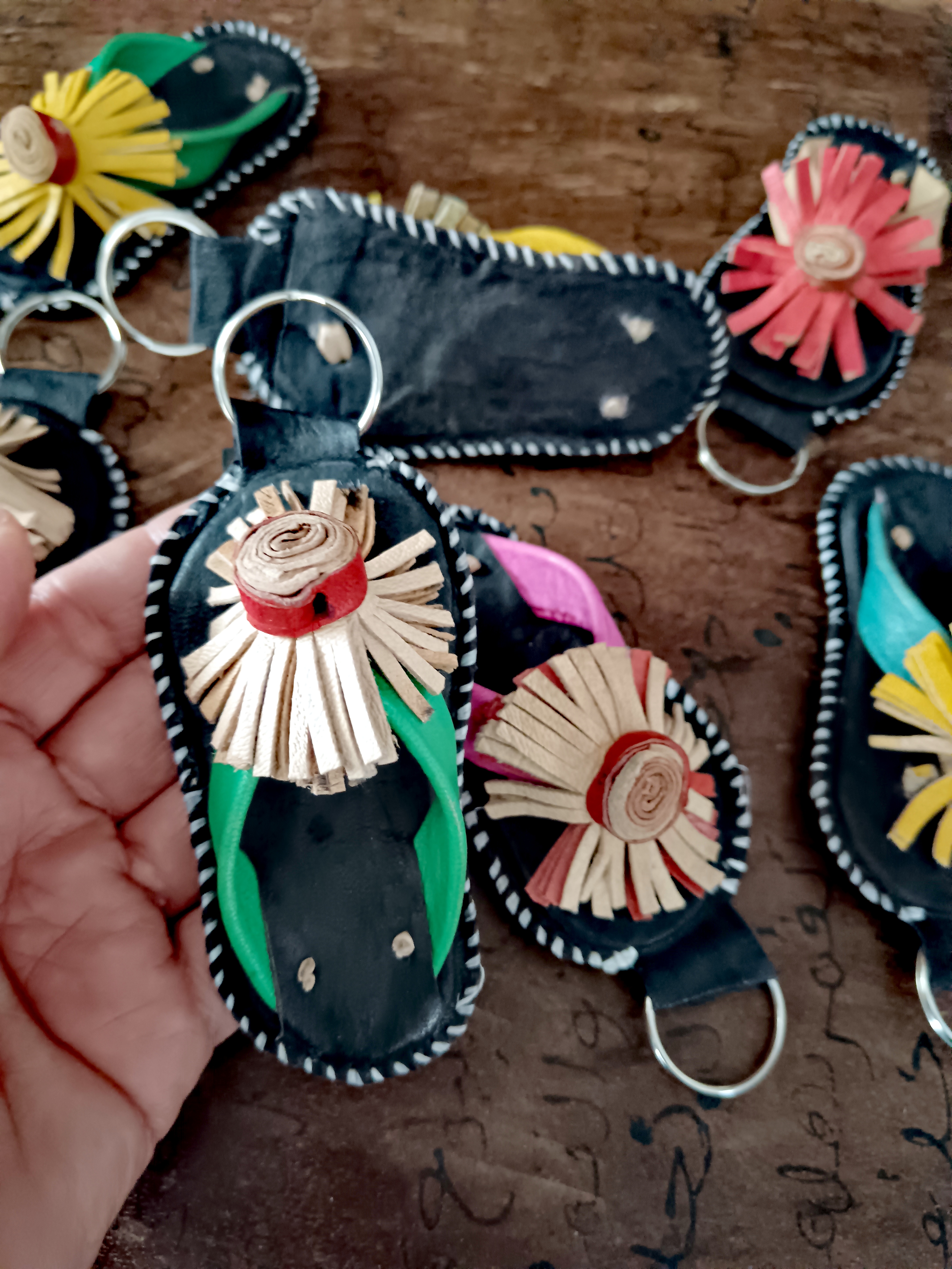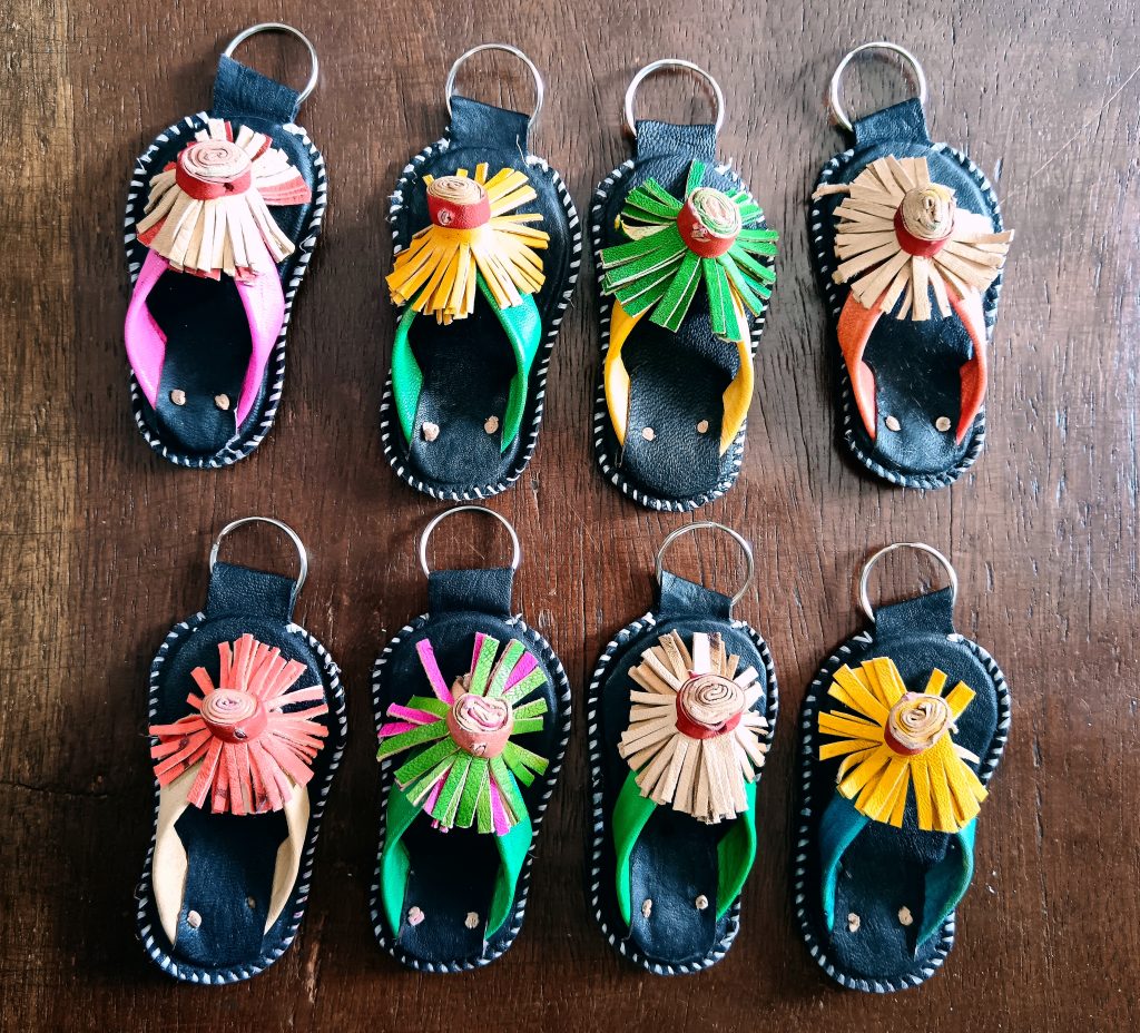 Preciosos llaveros artesanales hechos a mano en Ouagadougou, Burkina Faso, Africa del Oeste.