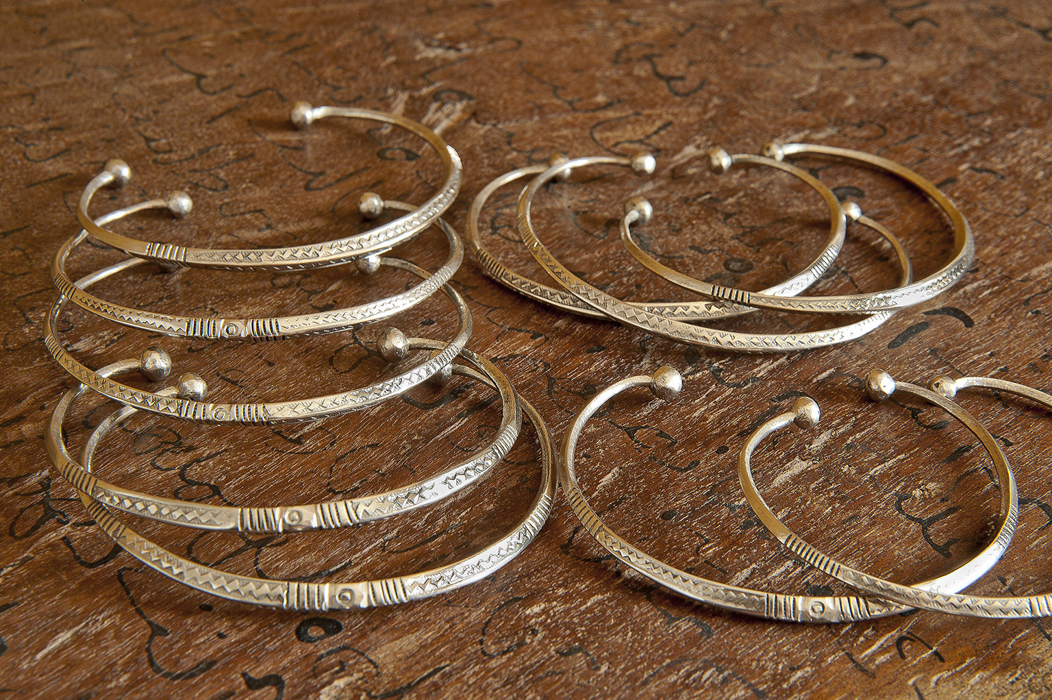 Pulseras de "plata tuareg" (plata de baja aleación pero que no se oxida ni cambia de color). Hechas artesanalmente en el norte de MalÃ. Africa del Oeste.